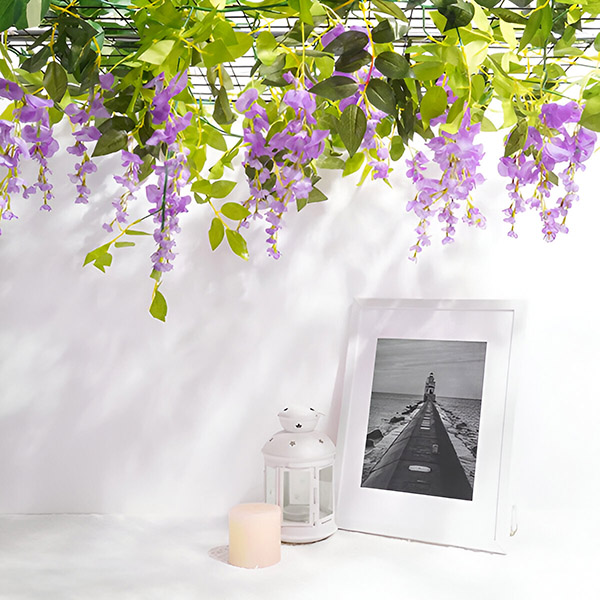 Chcesz stworzyć imponujące kompozycje kwiatowe? WISBLOOM, jasnofioletowa glicynia z bujnymi zielonymi liśćmi, idealnie nadaje się do dekorowania łuków, kratownic, ścian, witryn sklepowych, restauracji, biur, przyjęć i nie tylko. Odporne na promieniowanie UV i trwałe pnącze z kwiatami można umieszczać zarówno wewnątrz, jak i na zewnątrz, dodając żywego akcentu każdej aranżacji.