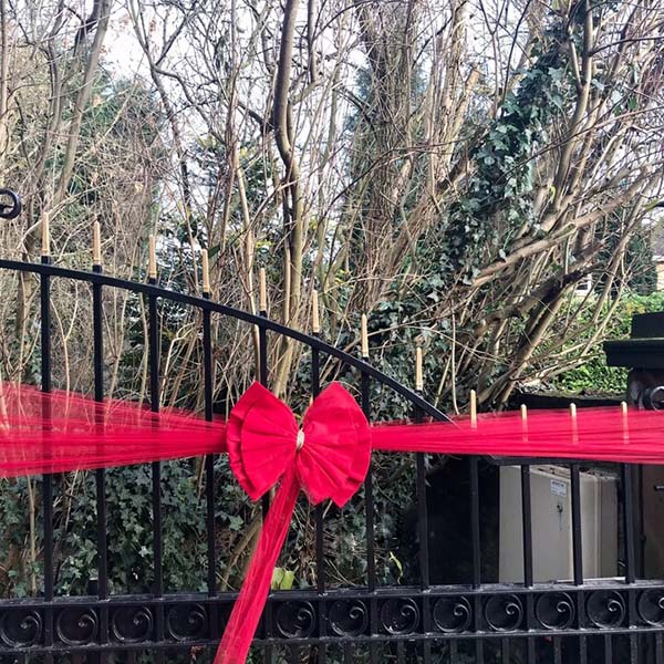 Przewlecz wstążkę przez otwory w drzwiach, skrzyżuj, zawiąż kokardę i zabezpiecz szpilkami.